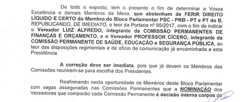 Um ofício do último dia 1º é a prova de que o bloco teria feito a indicação correta dos vereadores.