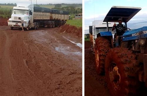 Tá indo para Cruzeiro do Oeste, Umuarama, Guaíra ou Salto Del Guairá pela Estrada Boiadeira? Atenção! Por causa das obras de asfalto no perímetro urbano de Tuneiras do Oeste o caminho voltou a contar com desvio. São cerca de 4 km. Aí, como choveu, deu problema. Nesta quarta-feira algumas carretas encalharam no trecho e precisaram da mãozinha de um trator.
