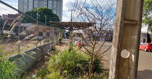 Olha só o estado dessa calçada em pleno centro de Campo Mourão. Fica na rua São Josafat, quase esquina com a av. Capitão Índio Bandeira. O matagal está bem ao lado de um ponto de ônibus. Usuários os transporte coletivo esperam o busão afastados do ponto temendo que cobras, aranhas e lagartos saiam do meio da quiçaça...