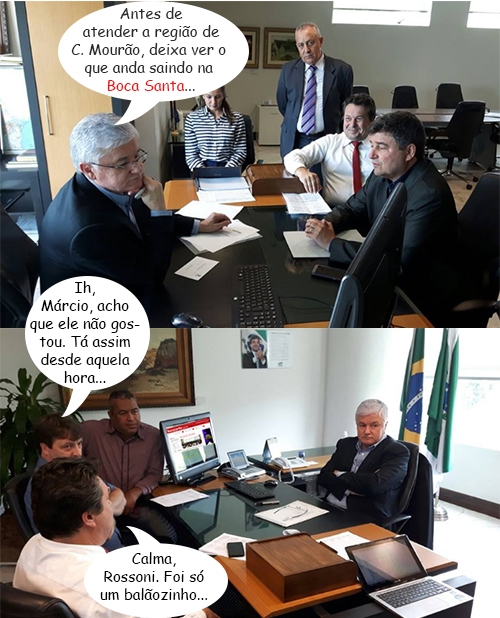 Os cliques são do Palácio Iguaçu, onde o chefe da Casa Civil, Valdir Rossoni, atendeu prefeitos da região – Valter Peres (Terra Boa) e Mauro Slongo (Luiziana). Ambos acompanhados pelo deputado Márcio Nunes.