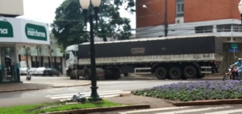 "Carreta entra na rua São Paulo, depois de passar pela av. Manoel Mendes de Camargo, no centro de Campo Mourão. Foto feita nesta segunda-feira".