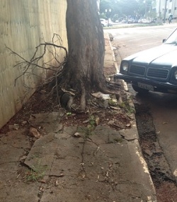 Rua Araruna, área central de Campo Mourão. Calçada mais estreita por causa de uma obra, tudo bem, mas com material de construção em cima e árvore, aliado a carro estacionado, o pedestre passa por onde?