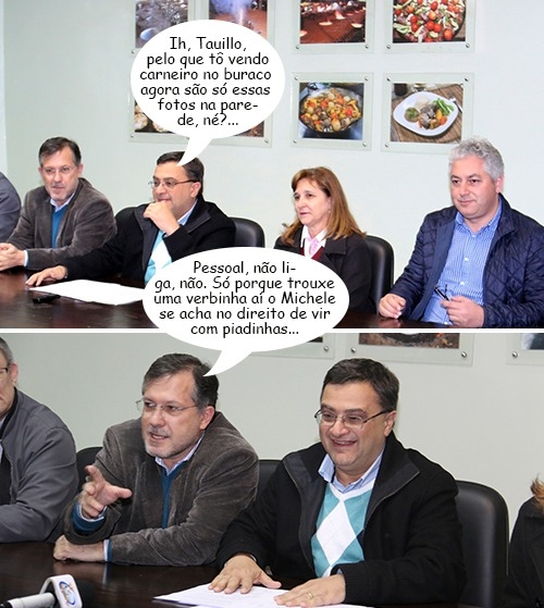 Os cliques são de sexta-feira, quando o secretário de Estado Michele Caputo (Saúde) esteve no gabinete do prefeito Tauillo Tezelli. Foi falar sobre a liberação de recursos para a prefeitura construir um posto de saúde e reformar outros dois, entre outras coisas mais. No mais, como dá pra ver, pode não ter Festa do Carneiro no Buraco este ano, mas foto do evento no gabinete não falta...