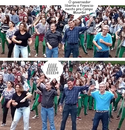 Os cliques são da manhã desta quarta-feira, quando aconteceu na praça São José a abertura oficial do Dia do Desafio. O prefeito Tauillo Tezelli participou ao lado do vice-prefeito Beto Voidelo. Veja que eles participaram mesmo. Ao lado, o presidente do Sindicato do Comércio Varejista, Nelson Bizoto, também não ficou parado.