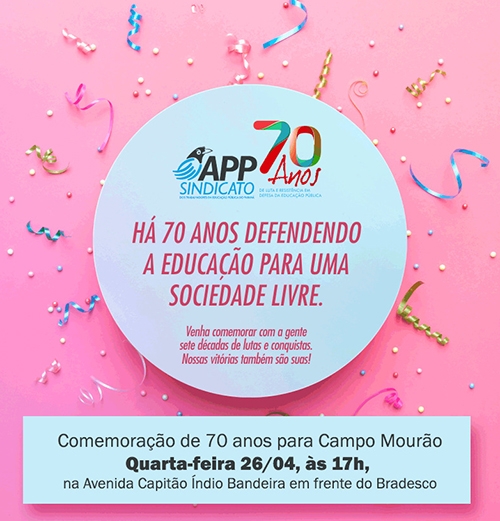 A APP/Sindicato completa 70 anos nesta quarta-feira e vai comemorar em Campo Mourão com bolo no calçadão.