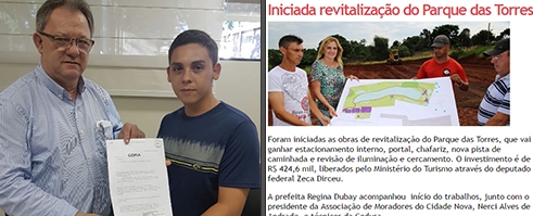 O estudante Mateus Cordeiro, de 16 anos, morador do jardim Cidade Nova, protocolou na Câmara um pedido de informações sobre a revitalização do Parque das Torres. O anúncio de início das obras chegou a ser feito em 2015, mas praticamente nada foi feito e ninguém mais viu sinal de obra nenhuma. A prefeitura tem R$ 424 mil liberados pelo Ministério do Turismo para a revitalização.