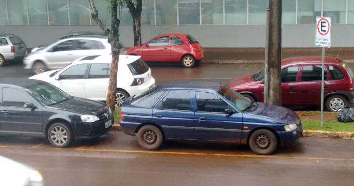 “O veículo da frente na vaga exclusiva da Polícia Militar e o carro de trás na vaga de motos. O flagra é da av. Irmãos Pereira, esquina com rua São Paulo, nesta quarta-feira, às 10h30”.