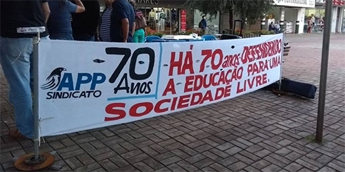 A APP/Sindicato usou suportes para segurar a faixa colocada neste quarta-feira no calçadão, em comemoração aos 70 anos da entidade. No mês passado o Sindicato dos Servidores levou multa de R$ 1,4 mil da prefeitura porque amarrou uma faixa em postes republicanos do calçadão. Foi num protesto contra a reforma da Previdência. O Sindiscam até entrou com recurso, alegando que não se trava de propaganda comercial, mas o pedido foi indeferido. Portanto, gato escaldado tem medo de água fria...