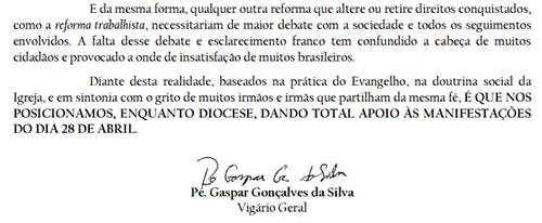 Também foi divulgada nota sobre a manifestação desta sexta-feira, assinada pelo padre Gaspar Gonçalves da Silva.