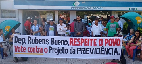 A Agência do INSS de Campo Mourão não abriu as portas na manhã desta quarta-feira. Motivo? Protesto de sindicatos, estudantes e movimentos sociais contra a proposta de reforma da Previdência. “Temer quer que você trabalhe até morrer”, destacava uma faixa no local. Outra faixa cobrava apoio do deputado federal Rubens Bueno. “Repeite o povo. Vote contra o projeto da Previdência”, diz o texto.