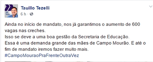 O prefeito Tauillo Tezelli postou no Facebook, nesta quinta-feira, que já garantiu o “aumento de 600 vagas nas creches”.