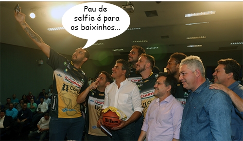 Até parte do time de basquete prestigiou a visita do governador Beto Richa a Campo Mourão. Pudera. Empresas do Estado, como Copel e Sanepar, são patrocianadoras. O técnico Emerson de Souza, o supervisor Marcão e os jogadores Cauê, Isaac e Douglas Nunes estiveram por lá, com direito a camisa do time e bola de presente ao governador. Na hora da selfie, o clic ficou por conta de Douglas Nunes e seus 2,10 metros de altura...