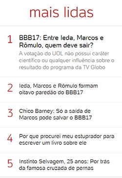 Carne fraca? Reforma da Previdência? Três anos de Lava Jato? Que nada! O que está preocupando o brasileiro é a formação e a votação do paredão do Big Brother Brasil, da Globo. Pelo menos é o que mostra o quadro com as matérias mais acessadas no portal UOL nesta segunda-feira. Dos cinco assuntos mais clicados, três são do programa global. Os 25 anos da cruzada de pernas mais famosa do cinema, dada por Sharon Stone no filme “Instinto Selvagem” também ficou no “top five”. Hummmm...