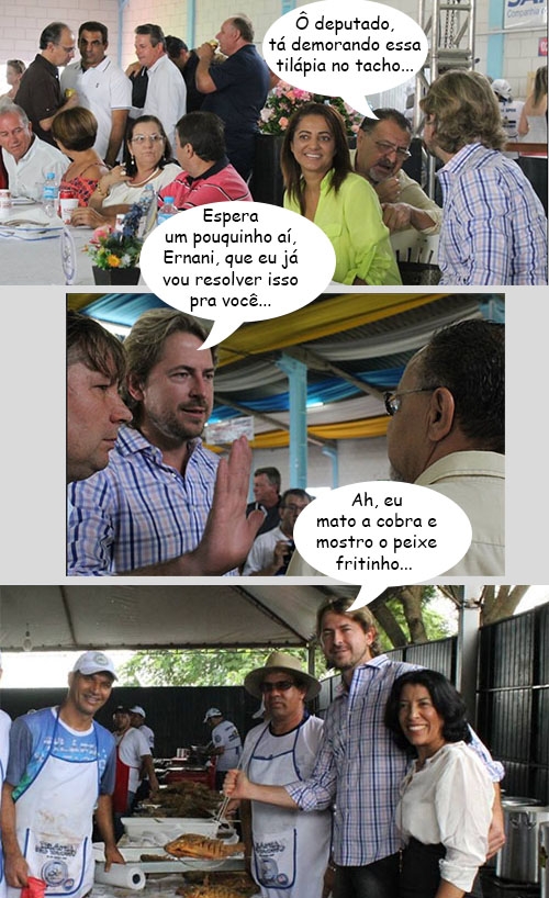 Os cliques são de domingo, em Rancho Alegre do Oeste, onde aconteceu a Festa da Tilápia no Tacho. O deputado federal Zeca Dirceu esteve por lá e ficou ao lado do vice-prefeito de Goioerê, Ernani Leite. Também fez pose ao lado da prefeita Suely Pereira junto com o peixe.