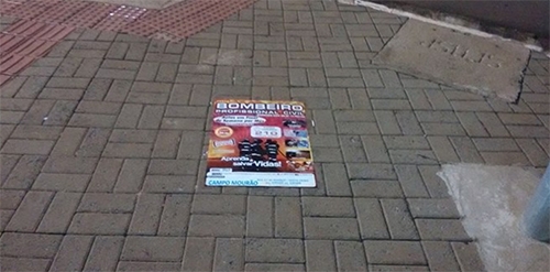 Outro dia Boca Santa mostou que cartaz com propaganda tinha sido colado até em poste dentro do pátio da prefeitura. A Secretaria de Fiscalização foi lá e multou a empresa responsável em R$ 937. Agora aparceu cartaz colado pelas calçadas do centro. Ficou uma trilha pela av Manoel Mendes de Camargo. Essse aí foi colocado bem em frente à Câmara de Vereadores.