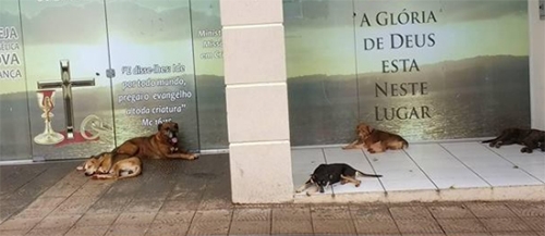 Cachorros descansam em frente igreja evangélica no centro de Campo Mourão. “A glória de Deus está neste lugar”, destaca a frase ao fundo. E foi bem ali que os cães ficaram. Foto: Sérgio Crespi