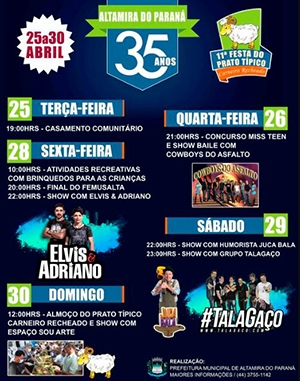 A programação será realizada de 25 a 30 e inclui shows musicais e de humor, casamento coletivo, recreação e festa gastronômica.