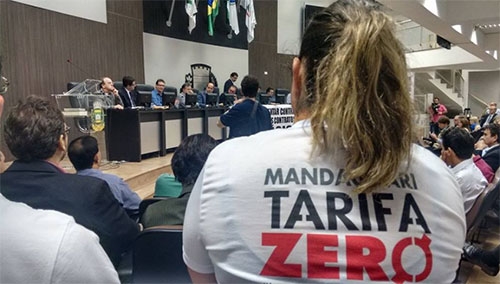 Chegaram vestido com camisete que pede “tarifa zero”, discursaram e fizeram foto com faixa junto à mesa principal.