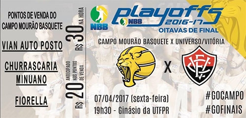 Campo Mourão estreia nesta sexta-feira (19h30) nos playoffs do NBB. Por playoffs leia-se mata-mata. O jogo será no Ginasião Belin Carolo, contra o Vitória/BA. A partida vale classificação para as quartas-de-final. Fica com a vaga quem conseguir três vitórias. Os dois jogos seguintes serão em Salvador. Campo Mourão terá a volta do capitão Cauê e do cestinha Betinho. Ingressos antecipados a R$ 20. Na hora, na bilheteria, R$ 30.