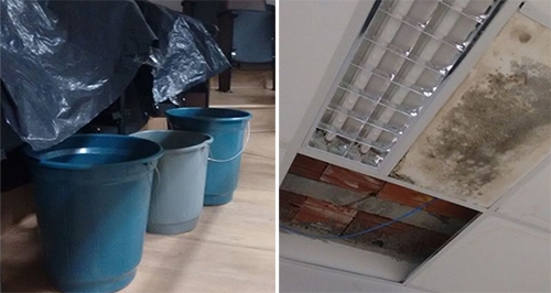 Um dia choveu forte e o telhado na Câmara de Campo Mourão não resitiu. A água pressionou parte do forro, que cedeu. Para não deixar água pingando sobre o mezanino foram colocados três baldes. Caderias foram protegidas com lona de plástico. Cerca de um ano depois o forro ainda não foi arrumado e os três baldes continuam no local. Assim, São Pedro pode até mandar chuva e a água do forro passar, mas os baldinhos estão lá, firmes e fortes, para o problema amenizar. E, assim, dá para frequentar a Câmara felizes para sempre...