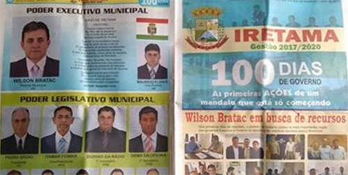 Quem disse que os prefeitos da região não se lembraram de “comemorar” os primeiros 100 dias de governo, completados semana passada? Em Iretama, Wilson Bratac mandou fazer até um jornalzinho de oito páginas para marcar o período. É verdade que boa parte foi para criticar a gestão passada, com uma página inteira falando de dívidas e outra mostrando a frota sucateada. Mas tem também ações em vários setores, incluindo a criação da Secretaria de Meio Ambiente e a retomada do programa Troca Verde.