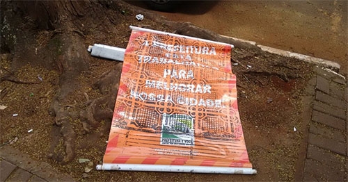 Está um pouco sujo, mas o banner acima traz a seguinte frase: “A prefeitura está trabalhando para melhorar sua cidade”. Foi usado na gestão anterior. Na semana passada apareceu jogado na calçada em frente à prefeitura. Hummmmm...