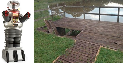 O robô de “Perdidos no Espaço” está de volta à Boca Santa para alertar perigo num dos “deques” do Parque do Lago. São aquelas estruturas de madeira para se ver o lago mais de perto (ou em cima dele). Algumas tábuas apodreceram e se soltaram. Os sensores do robô indicam que é melhor não entrar nesse aí.