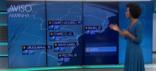 Não é que Campo Mourão apareceu no mapa do Jornal Nacional (Globo) desta quinta-feira? Foi na hora da previsão do tempo. Segundo a jornalista Maju, vai chover muito na região sul. “Tem alerta lá para ao sul, pode chover forte”, disse ela. Em seguida, citou três cidades do Rio Grande do Sul, uma de Santa Catarina e “Campo Mourão, que é perto de Maringá, lá no Paraná”.