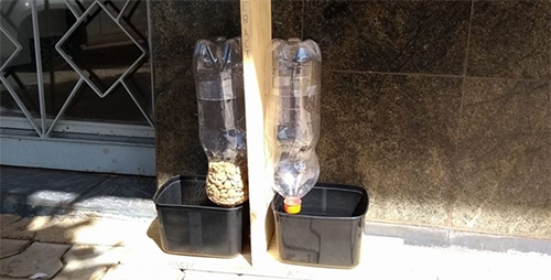Loja do centro de Campo Mourão reservando água e comida para cachorros de rua não é mais novidade. O que teve de novo é que os recipientes para atender a bicharada estão se modernizando. Esse aí, por exemplo, na rua São Paula, usa um sistema com garrafas pet que controla a água e comida à medida que vão sendo consumidos.