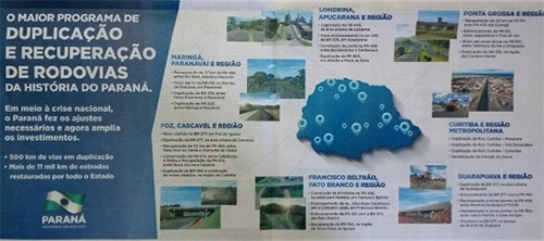 Propaganda do governo do Estado, publicada durante a semana em jornais de Campo Mourão, diz que “em meio à crise nacional, o Paraná fez os ajustes necessários e agora amplia os investimentos”. Aí cita algumas obras, boa parte delas das concessionárias de pedágio. São citados investimentos em 32 municípios, incluindo Paranavaí. Não tem Campo Mourão e nenhuma outra cidade da região. Isnf, isnif, isnif...