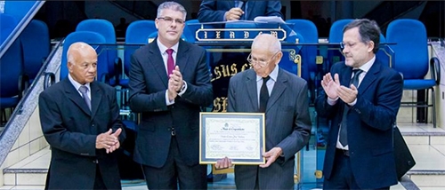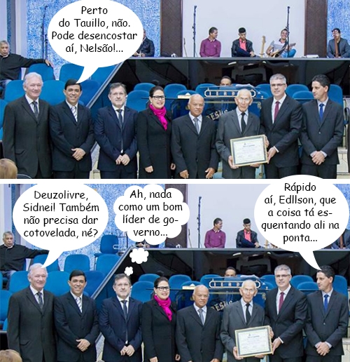 Que feriadão, que nada! A Câmara de Campo Mourão entregou moção nesta segunda-feira à noite. O homenageado da vez foi o pastor Cerino José Barbosa, de 93 anos. A entrega aconteceu na igreja Assembleia de Deus. Cinco vereadores participaram – Edilson Martins (autor da homenagem), Cabo Cruz, Jadir Pepita, Olivino Custodio e Sidnei Jardim. O prefeito Tauillo Tezelli também esteve por lá, com direito a jantar na mesma mesa que o ex-prefeito Nelson Tureck.