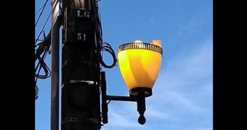 Na av. Capitão Índio Bandeira, perto da rua Roberto Brzezinski, a luminária foi quebrada, mas a lâmpada continua acessa, inclusive de dia. A foto é desta terça-feira.