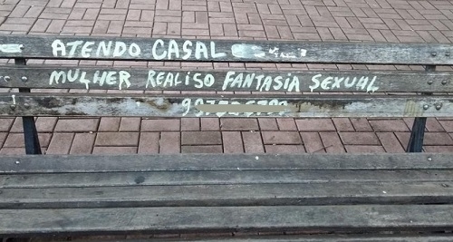 Bancos do calçadão de Campo Mourão continuam sendo utilizados para anúncios sexuais. Tem até o celular, devidamente atualizado com o nono dígito. Duro vai ser o fiscal explicar que não tem fantasias a realizar, mas uma multinha a aplicar...