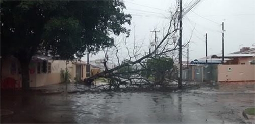 Av. José Wierzchon, esquina com rua Souza Naves, no jardim Albuquerque. A árvore caiu e trancou tudo em plena rota do transporte coletivo. Foto tirada às 11h40.
