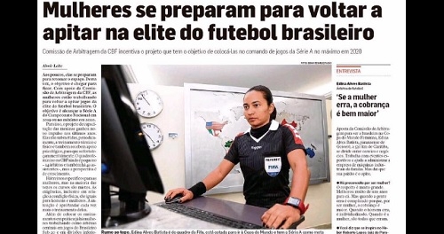 Olha quem foi destaque no jornal O Estado de S. Paulo: a árbitra Edna Alves, de Goioerê. Ela é do quadro da Fifa e está sendo preparada para apitar o Mundial Feminino, em 2019, na França. E ainda tem essa história de poder trabalhar na Série A do Brasileirão. Este ano Edna já comandou jogo da Série D. O Estadão faz até uma entrevista com a goioerense. "Se a mulher erra, a cobrança é bem maior", disse ela.