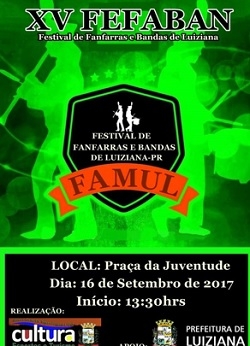 Luiziana - Acontece neste sábado (13h30), na Praça da Juventude, o 15º Festival de Bandas e Fanfarras. O evento vai reunir 14 corporações de cidades do Paraná e do Mato Grosso do Sul. O Fefaban é aberto à comunidade e a entrada é gratuita.