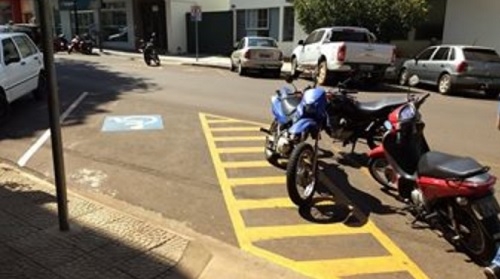 "Local destinado para o deslocamento do cadeirante até a rampa para a calçada sendo usado como estacionamento de motocicletas".