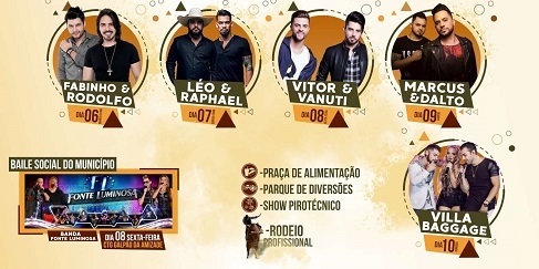A abertura oficial será às 20h, seguida de rodeio e show com a dupla Fabinho & Rodolfo.