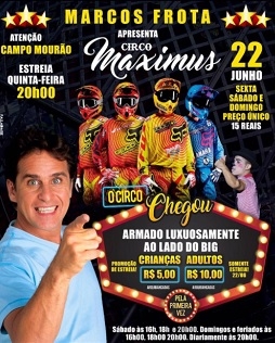 Reeeeeeespetáááável púúúúblico! Tem circo na cidade. O Circo Maximus estreia nesta quinta-feira (20h) em Campo Mourão. Está "armado luxuosamente" ao lado da rodoviária. Diz a propaganda que vai ficar apenas quatro dias, mas é bem provável que dê uma esticadinha. A estreia tem ingresso a R$ 10, sendo que crianças até 10 anos pagam só R$ 5. O ator Marcos Frota, apaixonado por circo, é o garoto propaganda do Maximus.