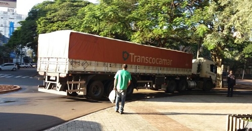 Carreta passa pelo trecho do calçadão, na av. Capitão Índio Bandeira, em Campo Mourão, na manhã desta segunda-feira.