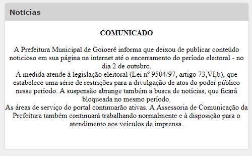 Acredite se quiser, mas nove meses depois da eleição municipal e seis meses depois da posse do novo prefeito, o site da prefeitura de Goioerê segue mantendo em destaque a mensagem sobre o período eleitoral do ano passsado. É que durante a campanha os portais oficiais não podem noticiar ações do executivo. O texto frisa que a medida iria "até o encerramento do período eleitoral - no dia 2 de outubro". Ah, vá ver já está valendo para a próxima eleição...