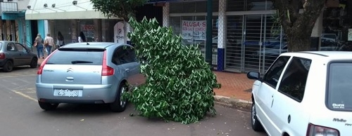 Quem disse que não teve vaga para estacionar no centro de Campo Mourão? Na rua Brasil, em frente à prefeitura, até galho de árvore consegue vaga. A foto é desta quinta-feira.