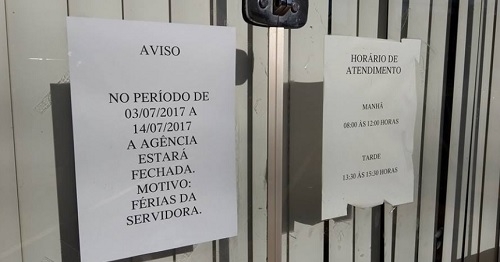 Está precisando da agência do Ministério do Trabalho de Campo Mourão. Muita calma nessa hora. Agência não abriu esta semana e só volta a funcionar no próximo dia 15. Um recado deixado na porta explica que o fechamento se deve às "férias da servidora". Ô dureza...