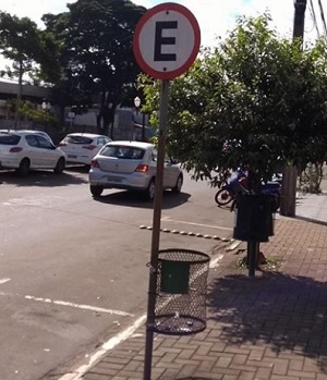 Na av. Capitão Índio Bandeira, perto da rua Araruna, o suporte de placa de trânsito tem utilidade extra: também serve de apoio para a lixeira. Isso mesmo: base para placa de trânsito e para lixeira ao mesmo tempo.