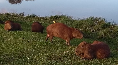 Cena desta terça-feira no Parque do Lago. Capivaras descansam, enquanto passarinho descansa sobre a capivara. Ilivaldo Duarte
