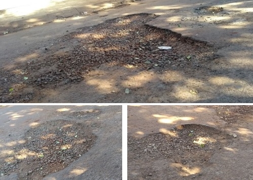 Buracos na rua Shuhei Uetsuka, trecho entre a av. John Kennedy e a rua Duque de Caxias, no Lar Paraná.