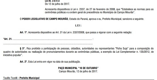 O prefeito Tauillo Tezelli sancionou a lei que proibe quem tem "ficha" suja de compor mesa de honra em eventos oficiais.