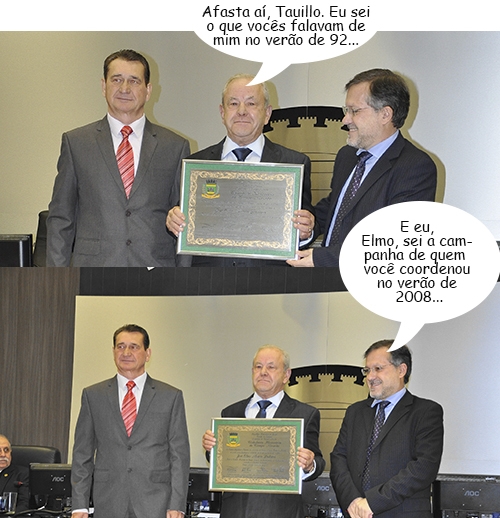 Olha aí mais cliques da sessão solene em que a Câmara de Campo Mourão entregou o título de Cidadão Honorário ao ex-vice-prefeito Elmo Linhares. O vereador autor do projeto, Edoel Rocha, e o prefeito Tauillo Tezelli, fizeram a entrega. Tauillo se elegeu vice-prefeito em 1992, quando Elmo perdeu para prefeito. E Elmo coordenou a campanha de reeleição do prefeito Nelson Tureck, em 2008, quando Tauillo perdeu.