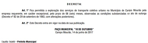 A prefeitura prorrogou por mais seis meses a concessão do transporte coletivo urbano de Campo Mourão.