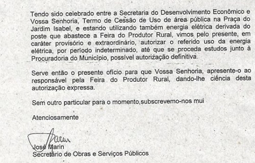 Outra autorização, assinada pelo secretário de Obras e Serviços Públicos da época, José Marin, permite o uso da energia elétrica.
